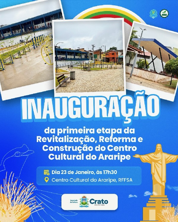 A Prefeitura do Crato, por meio da Secretaria Municipal de Cultura, inaugura hoje, sexta-feira, 23 de janeiro, às 17h30, a primeira etapa da reforma, revitalização e construção do Centro Cultural do Araripe, localizado no Largo da RFFSA. A entrega representa um avanço na política de valorização da cultura, do lazer e da ocupação qualificada dos espaços públicos do município.