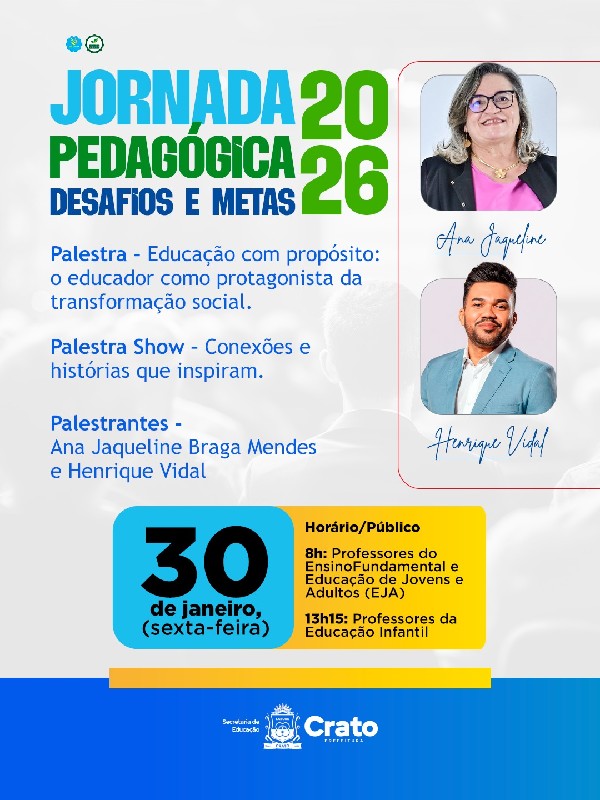 A Prefeitura do Crato, por meio da Secretaria Municipal de Educação, realiza nesta sexta-feira, dia 30 de janeiro, a Jornada Pedagógica 2026