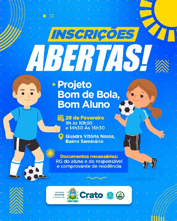 A Secretaria de Esporte e Juventude do Crato realiza, nesta quinta-feira, 26, as inscrições para mais uma edição do Projeto Bom de Bola, Bom Aluno iniciativa que une incentivo à educação e à prática esportiva para crianças e adolescentes do município.