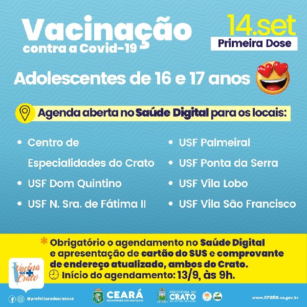 A Prefeitura Municipal do Crato, através da Secretaria de Saúde, inicia nesta segunda-feira, 13, o agendamento no Saúde Digital, a partir das 9h, para a Vacinação contra a Covid-19, dos adolescentes de 16 e 17 anos.