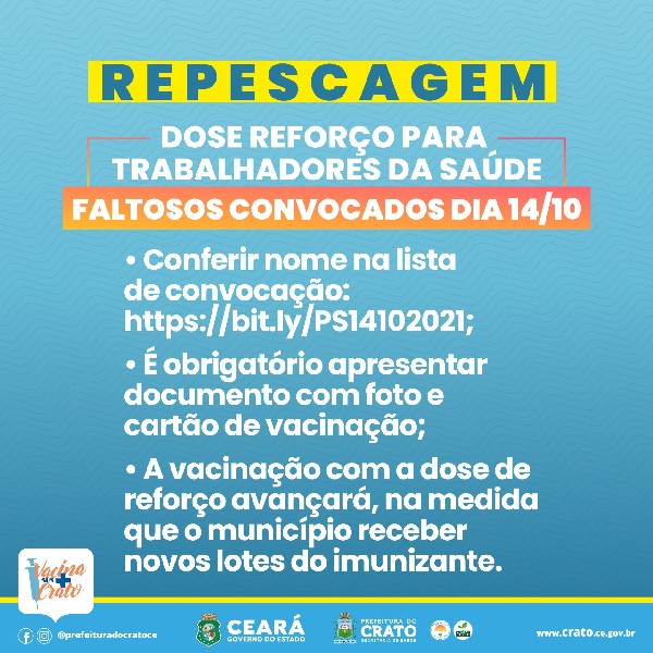 A Prefeitura do Crato, por meio da Secretaria Municipal de Saúde, informa que profissionais de Saúde convocados no dia 14.10, que não compareceram no local de vacinação, deverão procurar o Centro de Vacinação, no dia 27.10 (quarta-feira), no horário de 08h30 às 12h e de 13h às 16h, portando documentos e o cartão de vacina.