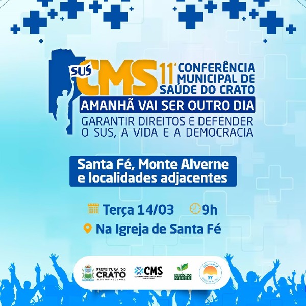 Nesta terça-feira, 14 de março, o município do Crato inicia a série de reuniões preparatórias para a sua 11ª Conferência Municipal de Saúde. A primeira será realizada no distrito de Santa Fé, a partir das 9 horas, e deve reunir a população local e adjacências.