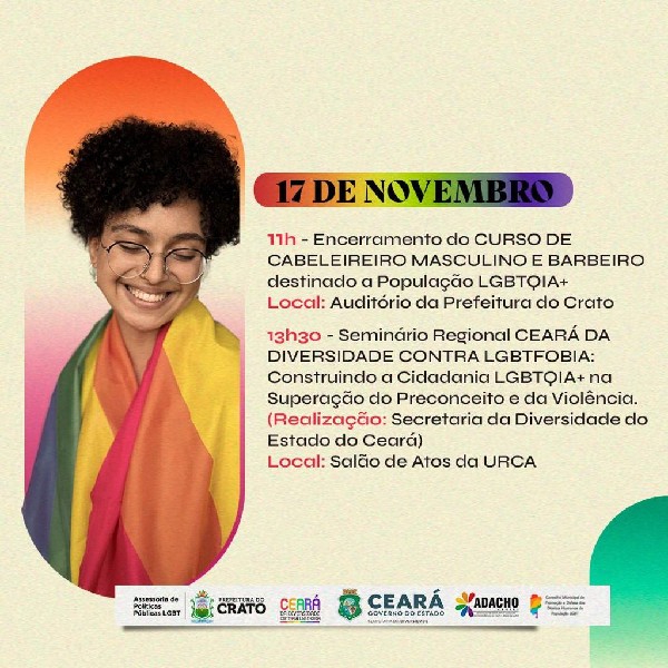 O dia 17 de novembro se inicia com a solenidade de encerramento do Curso de Cabeleireiro Masculino e Barbeiro destinado a população LGBTQIA+, que acontecerá às 11h, no auditório da Prefeitura Municipal. No período da tarde, às 13h30, terá o Seminário Regional Ceará da Diversidade contra LGBTFOBIA: Construindo a Cidadania LGBTQIA+ na Superação do Preconceito e da Violência, de realização da Secretaria da Diversidade do Estado do Ceará, no Salão de Atos da URCA.