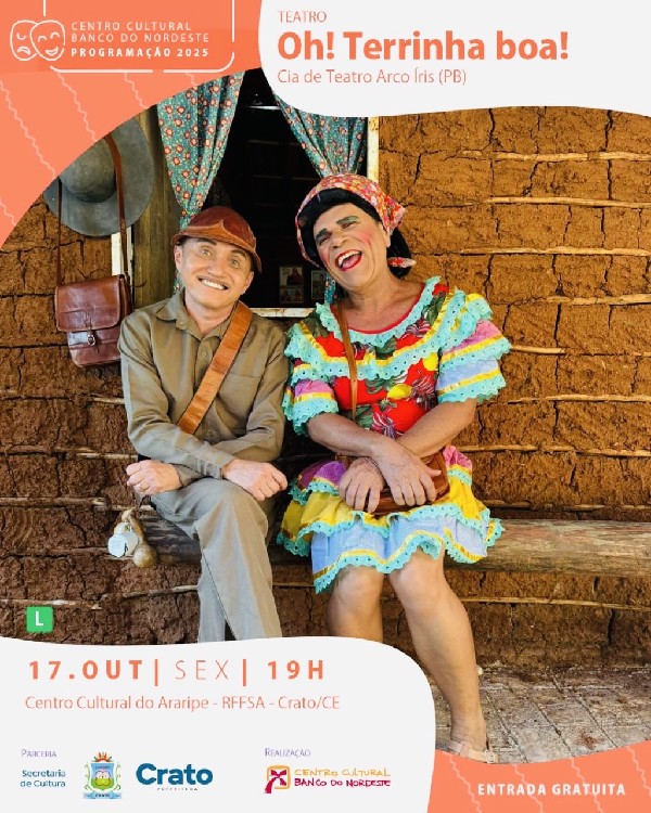 O Largo da RFFSA será palco, nesta sexta-feira, 17 de outubro, às 19h, de mais um grande momento cultural no Crato. O público vai poder assistir gratuitamente ao espetáculo "Oh! Terrinha Boa!", uma comédia envolvente que retrata, com sensibilidade e humor, a vida do sertanejo diante dos desafios impostos pela seca e pela migração.