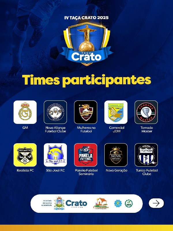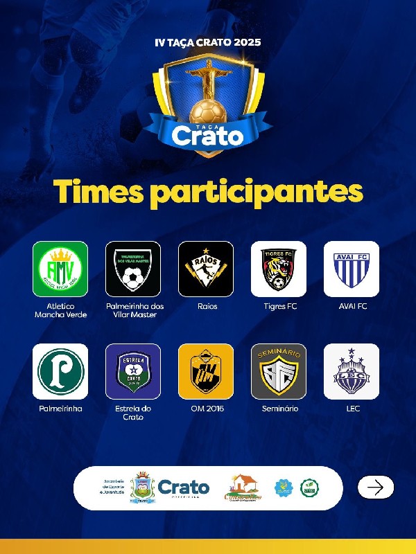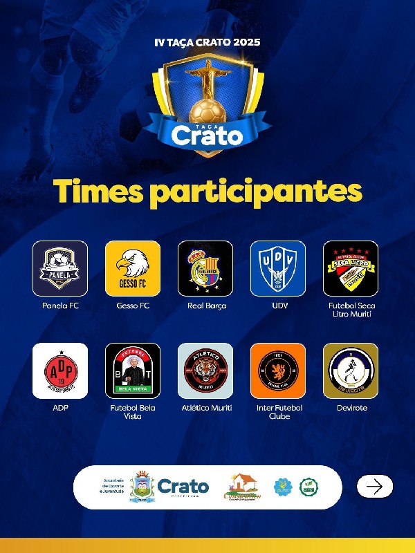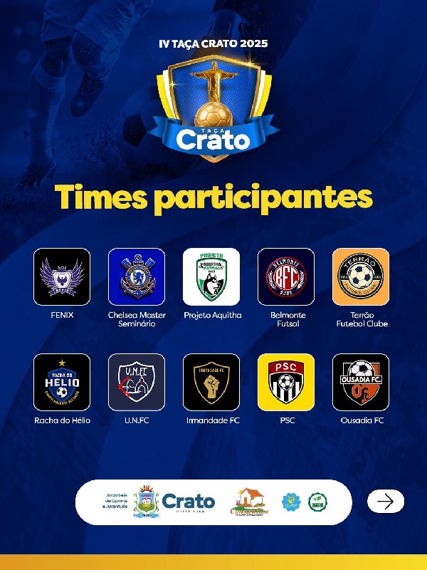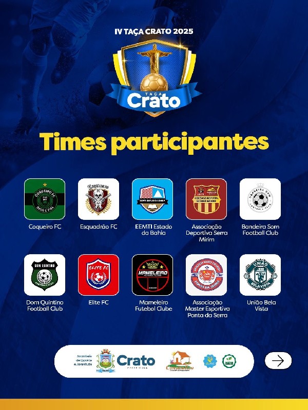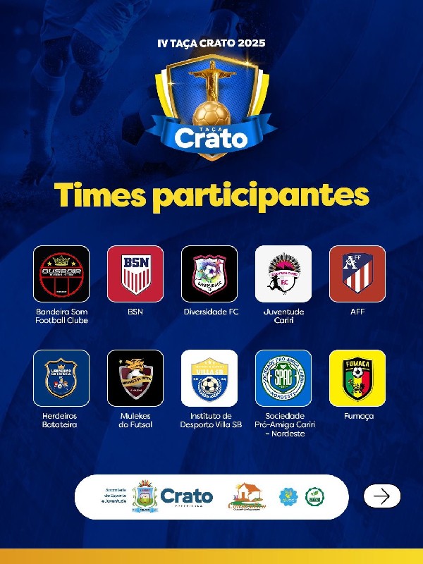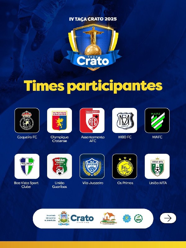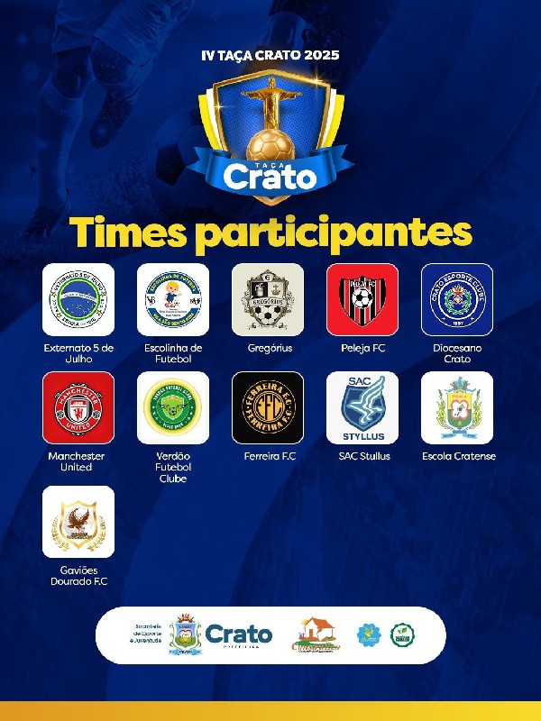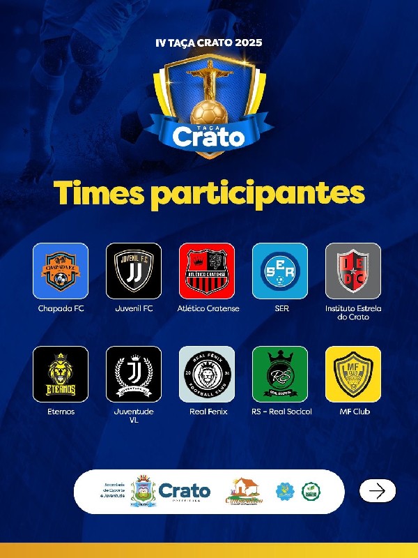 "A Taça Crato é o retrato mais autêntico da força do nosso futebol amador. Cada equipe leva consigo a garra e a paixão que movem o Crato. Estamos construindo um evento que valoriza nossas comunidades e inspira novas gerações", destaca Eudiane Pinheiro, gestora da Secretaria de Esporte e Juventude.
