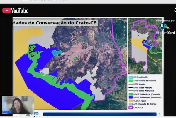 Brenda destacou a relevância do espaço da Chapada do Araripe e da Floresta Nacional do Araripe - FLONA, e o papel que a educação ambiental vem desenvolvendo, com os seus respectivos impactos junto às comunidades, incluindo unidades de preservação, rios, fontes, refúgio de Vida Silvestre do Soldadinho do Araripe - Revis, e as parcerias instituições para o fortalecimento das ações de impacto ambiental.